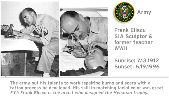 Some went on and stayed and made the military their career. For others, the military provided a launch into their art career. Al Plastino – co-creator of Supergirl and Brainyac and John Romita Sr- (Captain America), both designed and painted war posters while serving in the United States army. SIA and A&D teacher Frank Eliscu (designer/sculptor of the Heisman Trophy) while serving in the army, invented and patented a medical tattoo device, which was applied on battle scars. Frank Eliscu taught at both schools and retired in 1972.